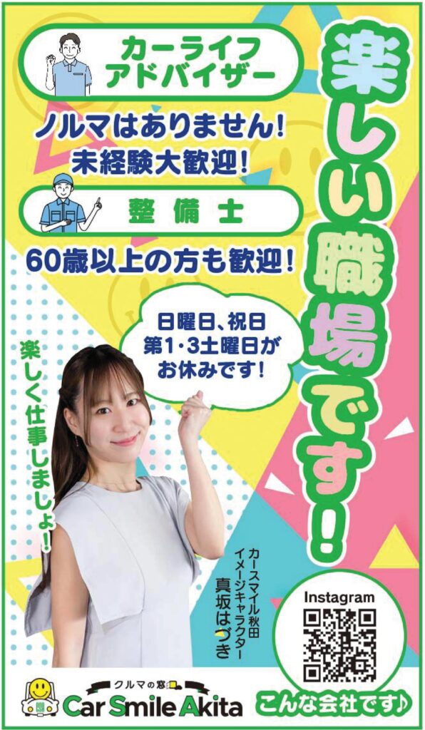 一緒にあたたかいお店づくりしませんか? ①カーライフアドバイザー(正社員)②自動車整備士(正社員)③自動車整備士(パート) 仕事 ①お客さまに価格だけでなく”安心して長く乗れる”お車を提案していただくお仕事です。②③車検、点検、一般整備、引取、納車 資格 64歳以下(65歳定年制のため)普通自動車免許必須(AT限定不可)※②③二級、三級自動車整備士、車屋・自動車整備の経験あれば尚可 時間 9:00~18:00①変形労働時間制(1ヵ月単位)③うち7時間程度 休日 第1,3土曜日、日曜、祝日、お盆、年末年始 給与 ①180,000円~250,000円※歩合制度あり(研修期間終了後、支給開始)②200,000円~290,000円※資格手当あり ③時給1,200円~1,500円 待遇 社保完備、昇給、通勤手当あり働きやすいユニフォーム、冬利用ジャンパー支給あり①②賞与あり③正社員登用あり 元気な挨拶ができる方、大歓迎!お問い合わせ・見学はお気軽に♪履歴書(写真添付)を郵送ください。【受動喫煙】屋内禁煙(屋外に喫煙所設置)【試用期間】3カ月担当:畠山(はたけやま) 018-853-1789